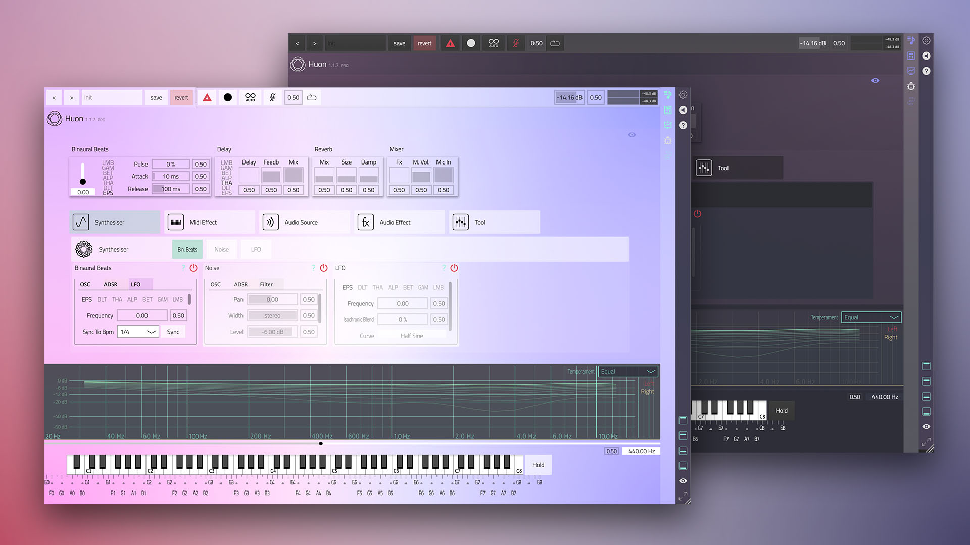Huōn Studio was developed as part of my master’s thesis – guided by the idea of exploring sound as a medium for healing and expanded awareness. What began as part of a multimedia performance grew into an independent plugin through scientific research on frequencies like binaural beats and isochronic tones – back then still named Healea.